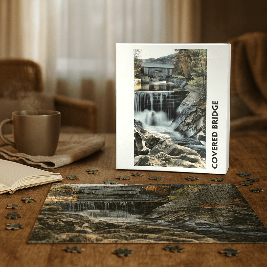- A challenging 1000-piece jigsaw featuring a picturesque covered bridge and waterfall on a crisp autumn day.